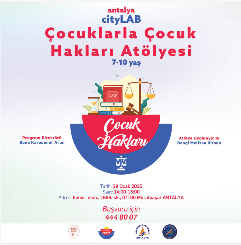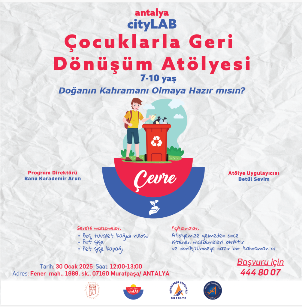Akademi, sivil toplum, yerel yönetimler ve özel sektörü bir araya getirip Antalya’da her yaş grubunun ihtiyaç ve isteklerine yönelik atölye çalışmaları yürüten Antalya CityLAB sömestir tatilinde de 7-10 yaş arası çocuklar için atölye çalışmaları hazırladı. Her biri konusunun uzmanlarıyla yürütülecek atölye çalışmaları Senex Dernek, Muratpaşa Belediyesi ve Akdeniz Üniversitesi öğretim üyelerinin iş birliğiyle gerçekleştiriliyor.