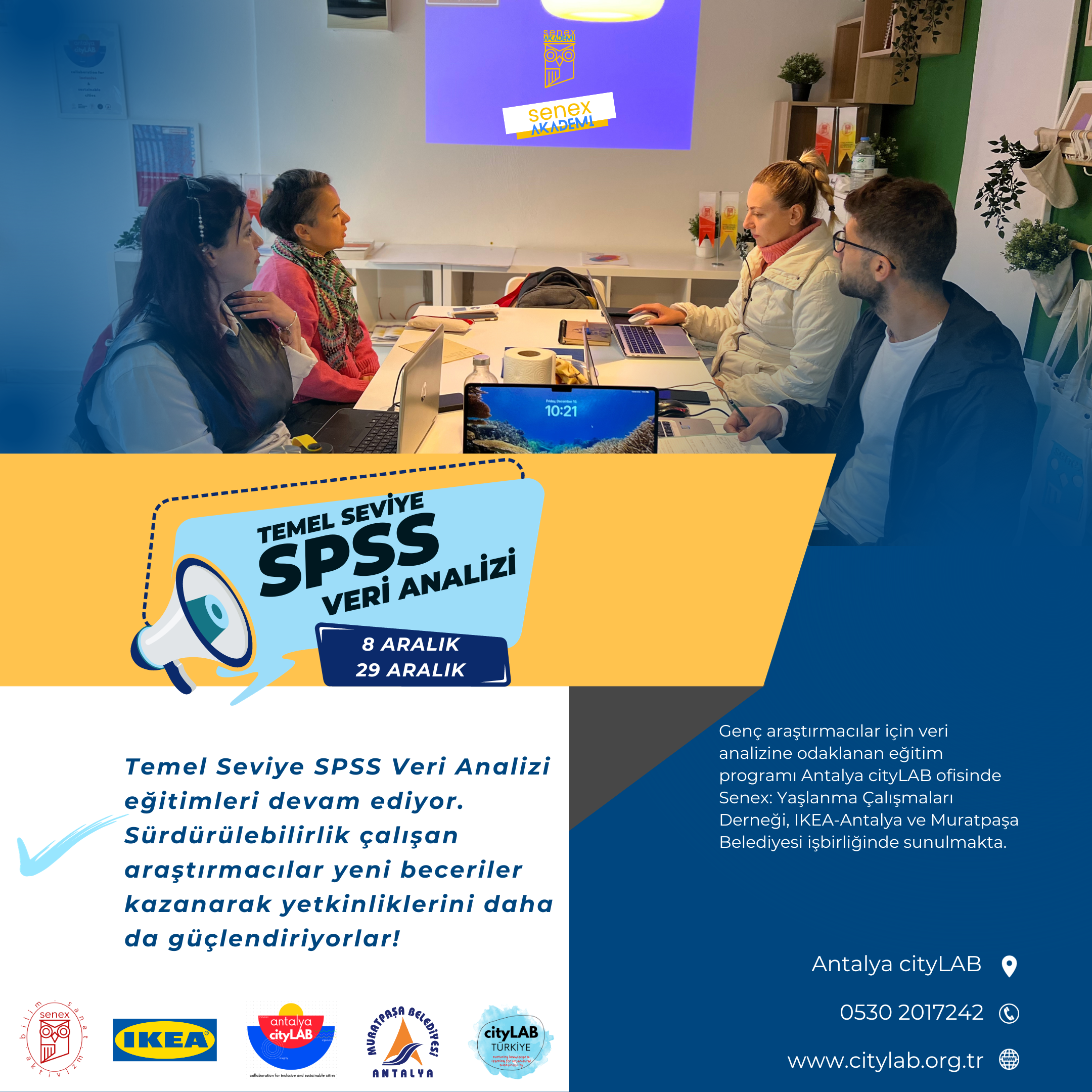 Sürdürülebilirlik ve kent hakkı üzerine araştırmalarını gerçekleştiren genç araştırmacılar IKEA-Türkiye tarafından destekleniyor. Genç araştırmacılar için veri analizine odaklanan eğitim programı Antalya cityLAB ofisinde Senex: Yaşlanma